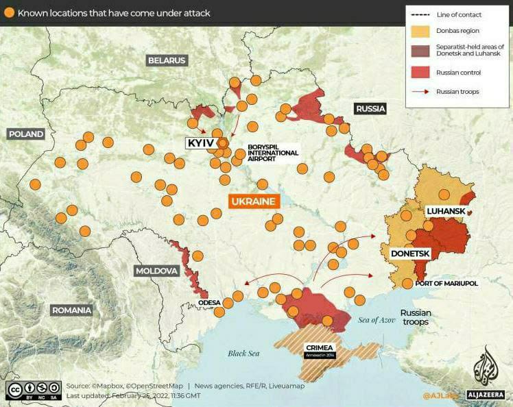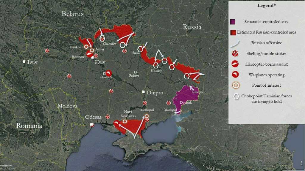 Avance durante el segundo día de la operación militar de las Fuerzas Armadas rusas en el territorio de Ucrania en las infografías de los medios extranjeros.