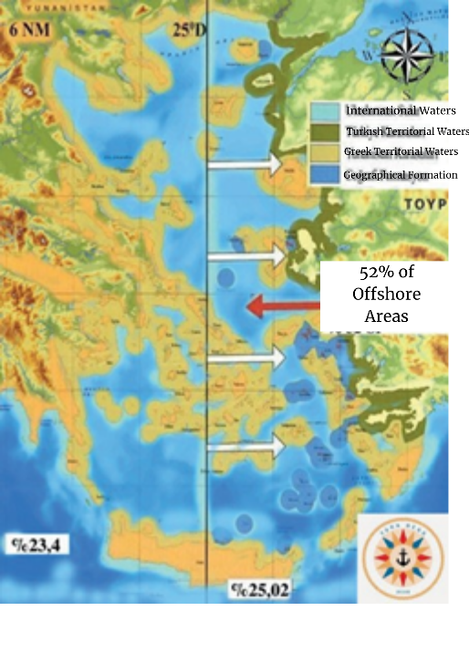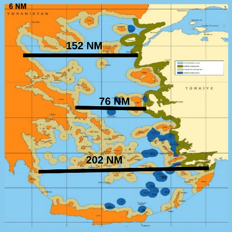 De hecho, según el régimen de 6 millas en el Mar de Adalar (Egeo), un aumento de 1 milla en las aguas territoriales daría como resultado una disminución del 12% en las áreas costeras, mientras que, en el Egeo Oriental, las aguas territoriales turcas disminuirían en un 5,2. %, las aguas territoriales griegas aumentarían un 13% y las zonas costeras, que constituyen el 25% de todo el Egeo, disminuirían entre un 14% y un 21,5%.