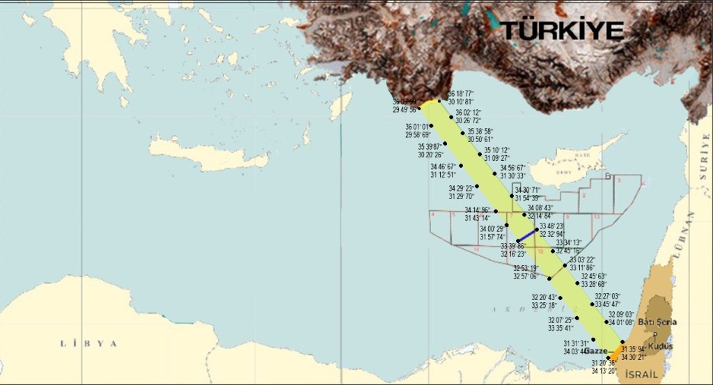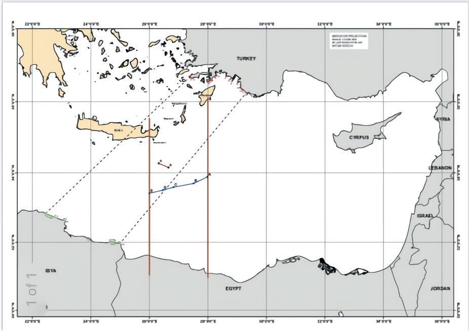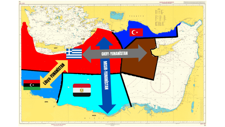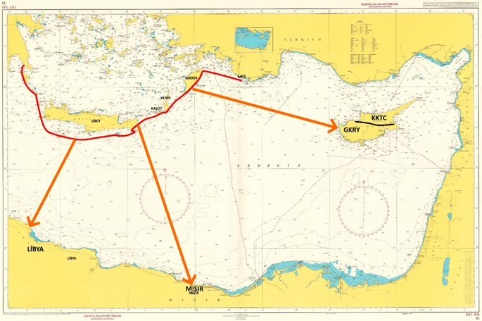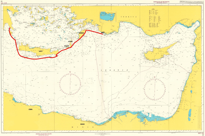 Como se puede ver en el mapa siguiente, Grecia, asumiendo que es un estado archipelágico, afirma que la línea fronteriza de su país en el Mediterráneo oriental es la línea que conecta Meis-Rodas-Kerpe-Kaşot-Girit-Gavdos-Small Trough- Large Trough- Península de Mora.