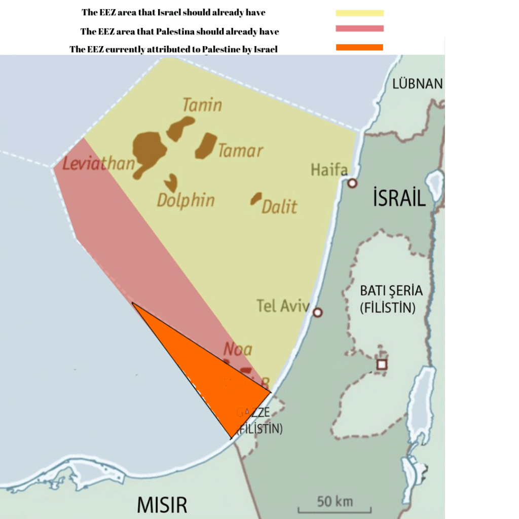 Turquía tiene una costa mutua con Libia y una costa mutua con Palestina. Ahora, nuestra sugerencia es que, si se firma un acuerdo de delimitación de jurisdicción marítima entre Turquía y Palestina basado en las costas mutuas de turco-palestinas, Palestina ganará 8.510 km2 más de superficie marítima y, al mismo tiempo, los habitantes de Gaza tendrán un documento legal de su territorio en sus manos.