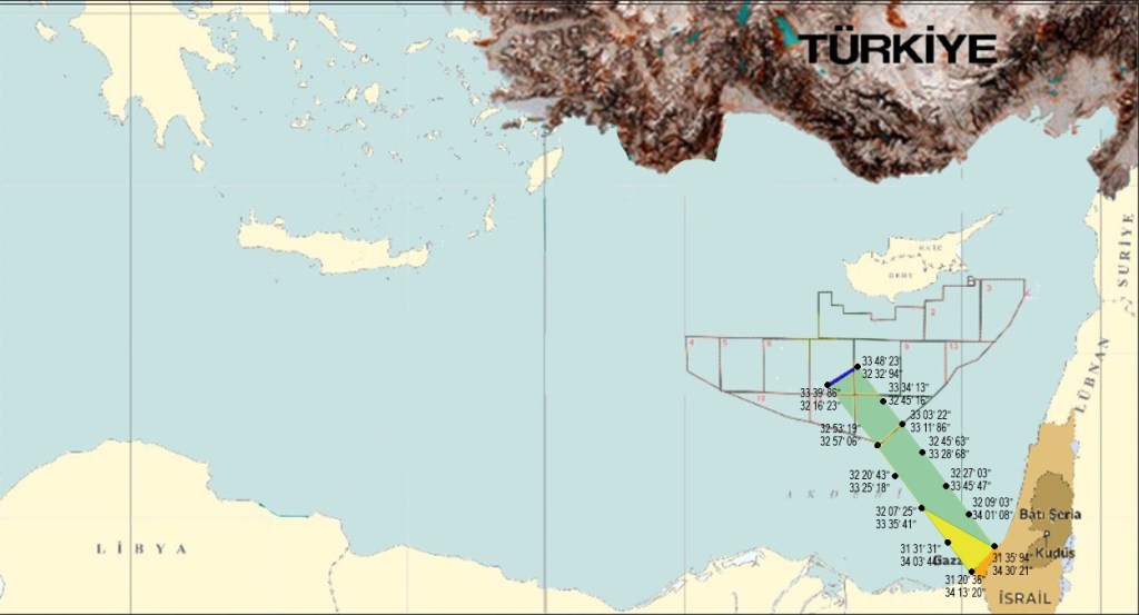 Por el momento, parece que el actor que plantea una amenaza a la paz, la estabilidad y la seguridad en el Mediterráneo oriental es Israel. Israel quiere ocupar Gaza y al ocuparla, habrá capturado esta zona, la única costa del pueblo palestino, y por tanto habrá capturado y ocupado la zona económica exclusiva que surge de Gaza. Ya ha ocupado el 80% de las zonas marítimas de Gaza a partir del acuerdo que firmó con la Administración grecochipriota del sur de Chipre en 2010, como se muestra en el mapa siguiente.