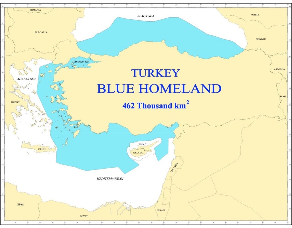“Mavi Vatan-Patria Azul” representa las áreas de jurisdicción marítima turca actuales y previstas. Es un término no sólo aceptado por el público turco sino también aceptado y respetado por el público mundial. Las zonas de jurisdicción marítima de Turquía existentes o que se prevé declarar se encuentran en los mares circundantes de Turquía y el mar de Mármara. La suma de todas las áreas de jurisdicción marítima se define como “Territorio Marítimo Turco (Patria Azul)”. En general, según el derecho marítimo, el estado de los mares que rodean Turquía es de mar cerrado o semicerrado.